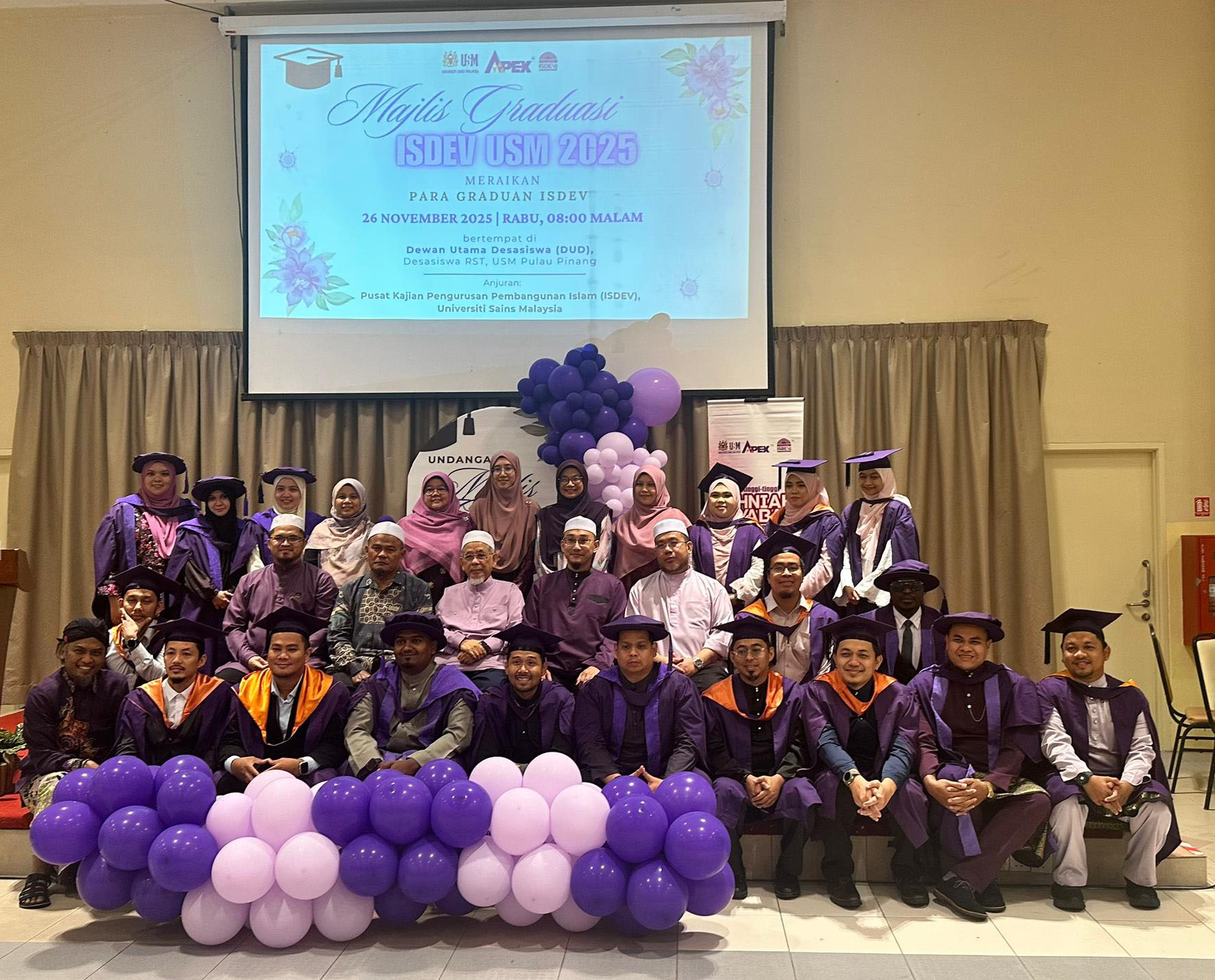USM, PULAU PINANG, 26 November 2025 – Pusat Kajian Pengurusan Pembangunan Islam (ISDEV) USM melahirkan graduan berprestij dalam bidang pembangunan Islam termasuk sistem kewangan Islamik, apabila seramai 29 graduan menerima pengijazahan pada peringkat Doktor Falsafah dan Sarjana pada Sidang Ketiga Upacara Konvokesyen Ke-63 USM. |