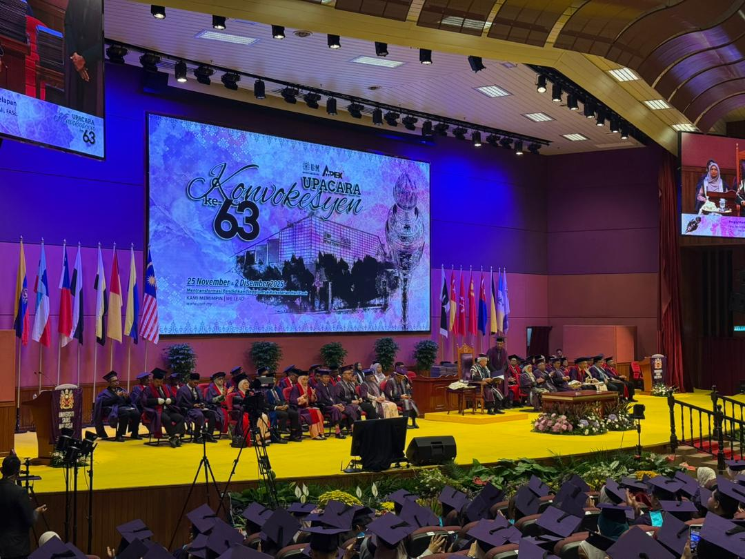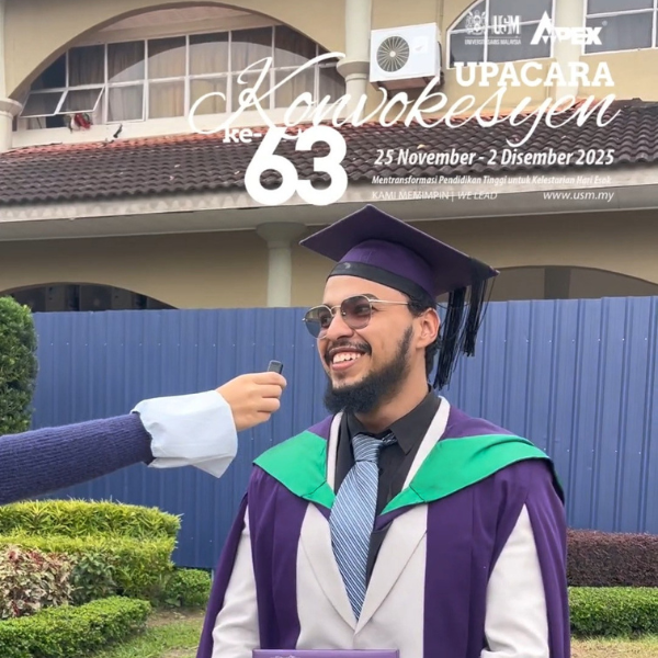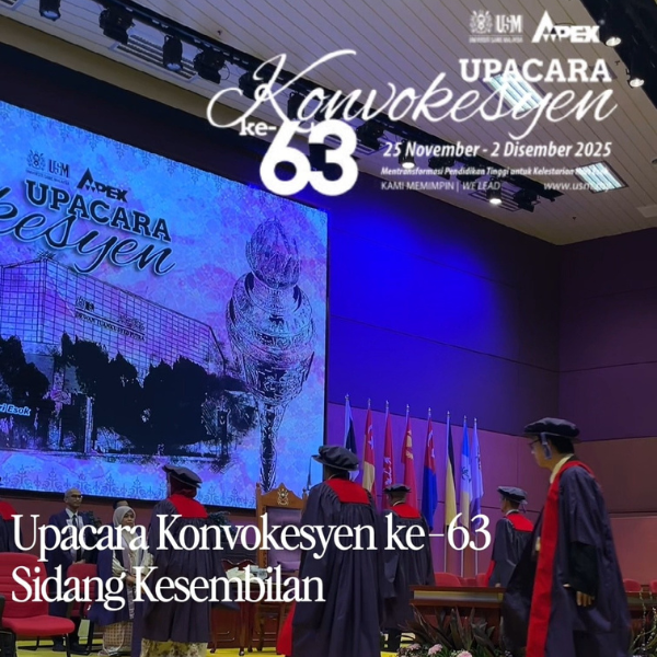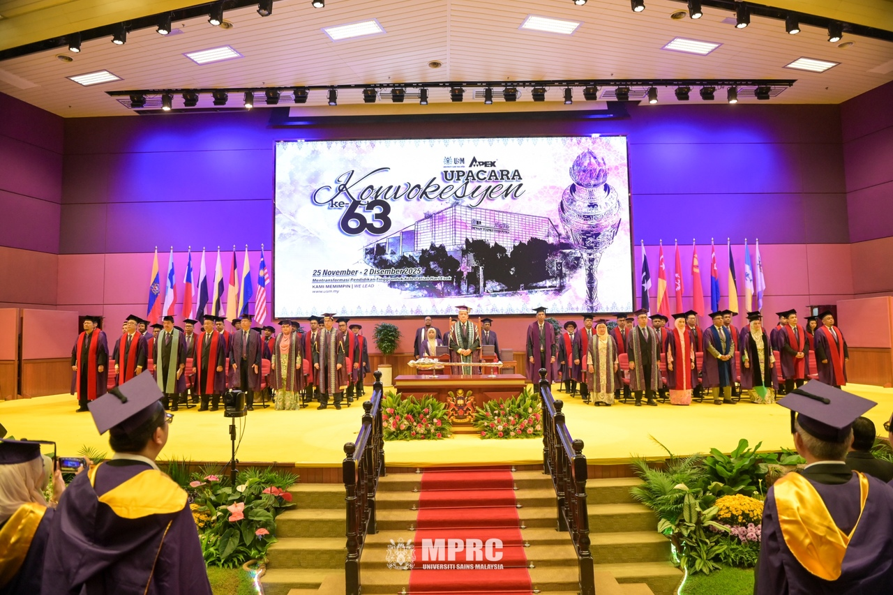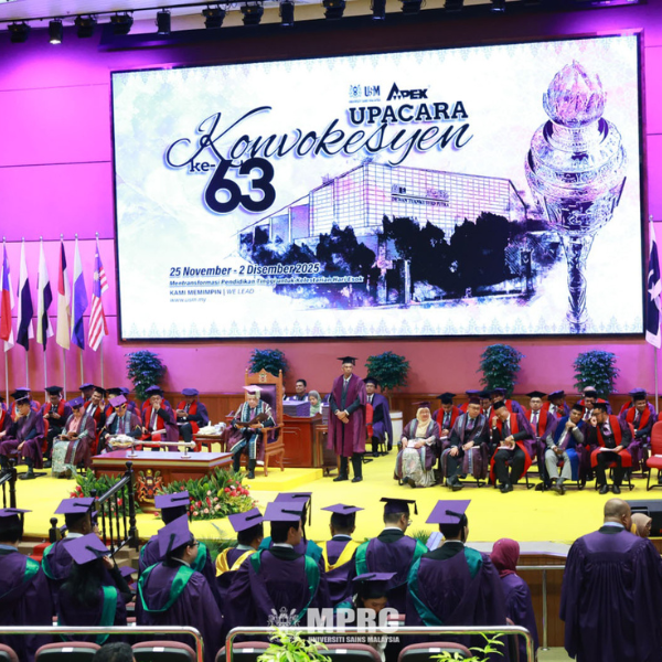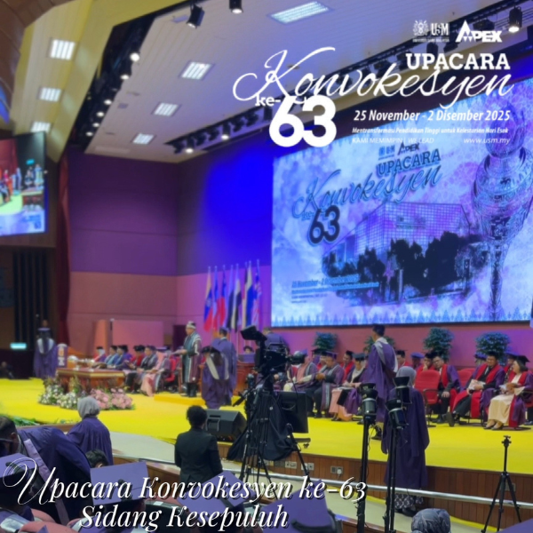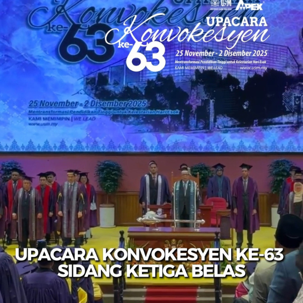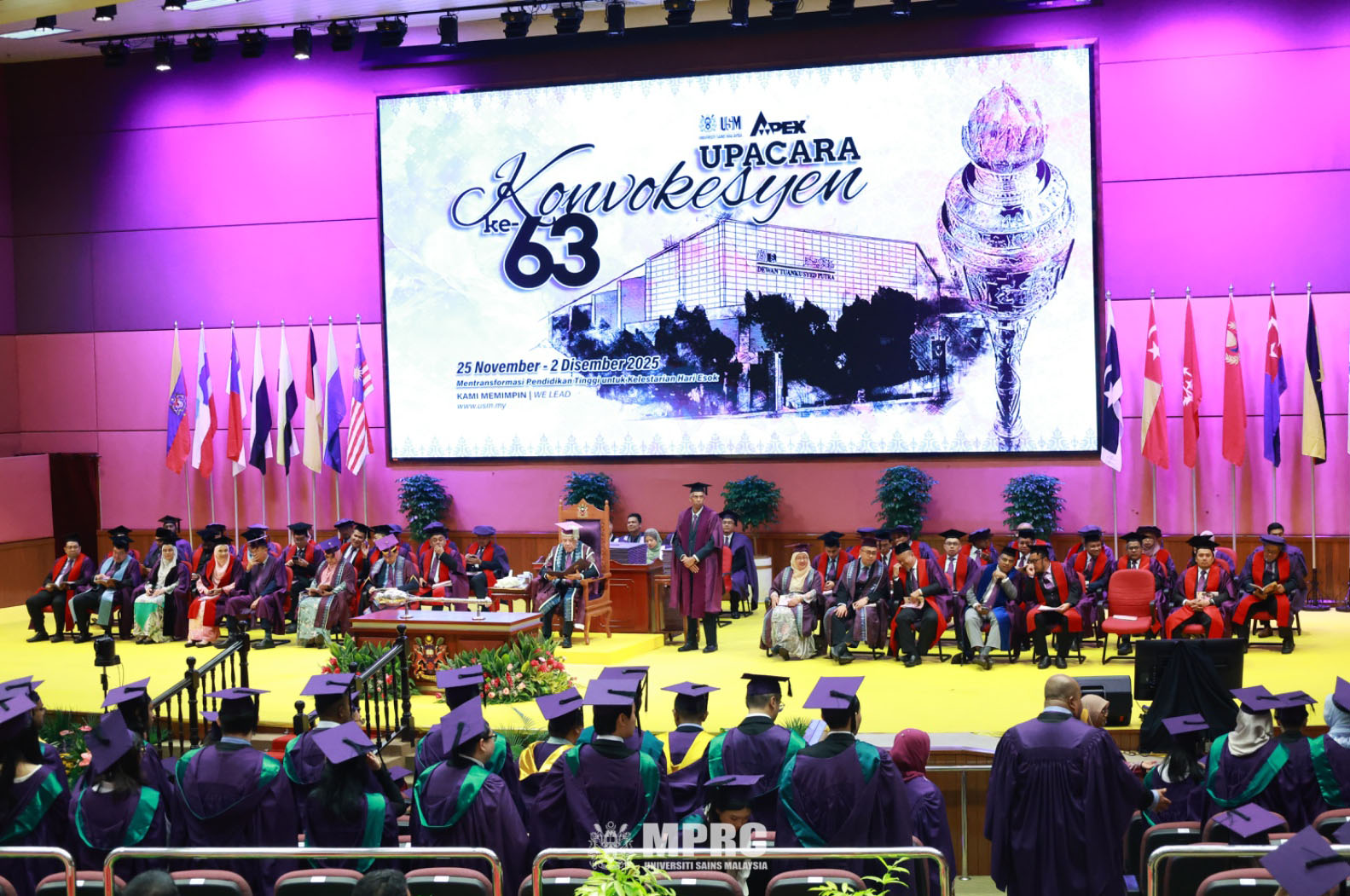 USM, PULAU PINANG, 26 November 2025 – Majlis Konvokesyen Universiti Sains Malaysia (USM) Ke-63 Sidang Ketiga diisytiharkan pembukaannya oleh Pro-Canselor, Tan Sri Datuk Dr. Zulkefli A. Hassan, dan berlangsung dengan penuh meriah bagi meraikan graduan daripada pelbagai peringkat pengajian melibatkan penganugerahan Ijazah Tinggi dan Ijazah Sarjana Muda. |
