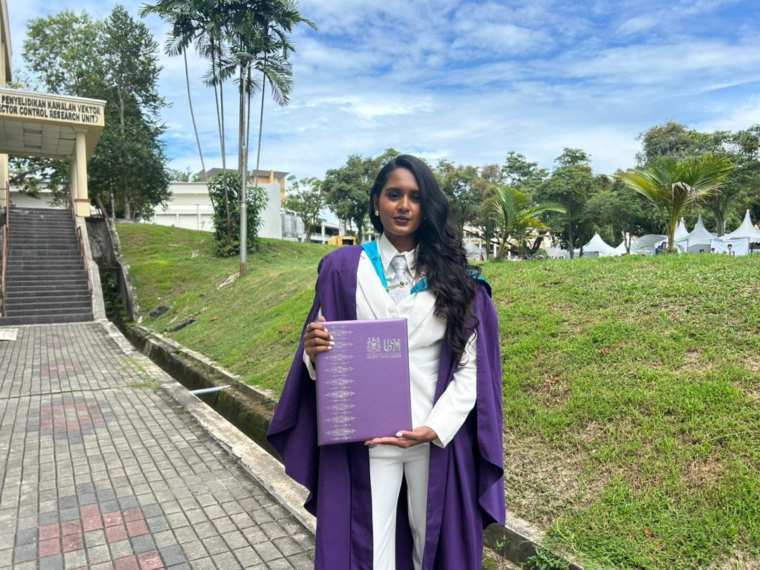 USM, PULAU PINANG, 29 November 2025 – Prathina Saravanamuthu, graduan Ijazah Sarjana Muda Komunikasi dari Universiti Sains Malaysia (USM), menamatkan pengajiannya dengan kecemerlangan sambil membina minat mendalam dalam strategi komunikasi, penglibatan global dan penceritaan berasaskan tujuan, sekali gus menyerlahkan peranan Pusat Pengajian Komunikasi dalam melahirkan graduan serba kompeten. |