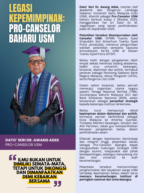 USM PULAU PINANG, 25 November 2025 – Dato’ Seri Dr. Awang Adek, mantan staf akademik dan Pengerusi Lembaga Gabenor Universiti Sains Malaysia (LGU USM), dilantik sebagai Pro-Canselor USM yang baharu berkuat kuasa mulai 1 Oktober 2025, menggantikan Tan Sri Dato' Dr. M. Jegathesan yang tamat tempoh perkhidmatan beliau pada 30 September 2025. |