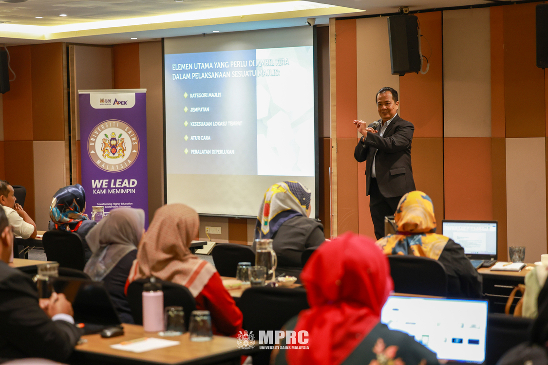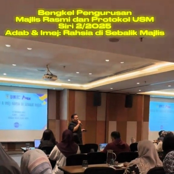 USM PULAU PINANG, 9 Disember 2025 – Bengkel Pengurusan Majlis Rasmi dan Protokol USM Siri 2 anjuran Pusat Media dan Perhubungan Awam (MPRC) berlangsung di Hotel Eastin, sebagai kesinambungan usaha memperkukuh kefahaman warga universiti terhadap etiket, adab, dan imej dalam penganjuran majlis rasmi, di samping meningkatkan keupayaan PTJ mematuhi kriteria pengurusan majlis yang digariskan secara profesional. |