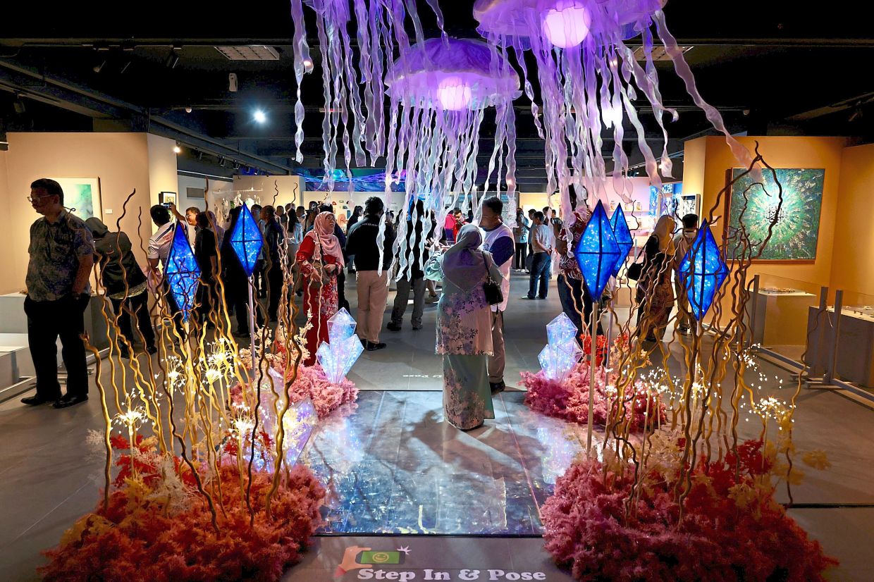 Crowds checking out the kinetic jellyfish installation among the highlights of the Aquamarine exhibition at Penang State Art Gallery. — ZHAFARAN NASIB/The Star